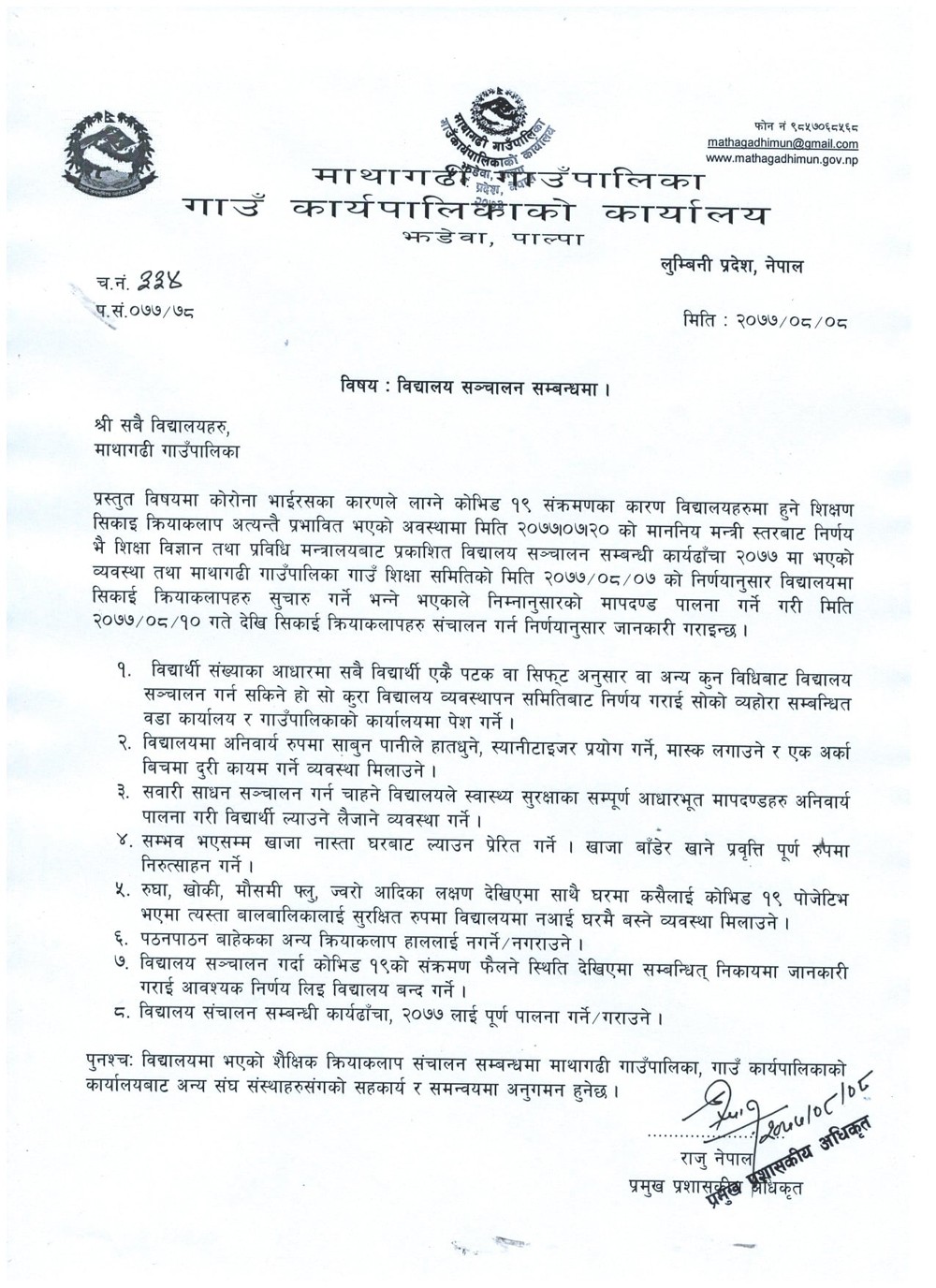 पाल्पा । जिल्लाको माथागढी गाउँपालिकाका सामुदायिक तथा संस्थागत विद्यालयहरु मंसिर १० देखि सञ्चालन हुने भएका छन् । सरकारले कोभिड–१९ संक्रमणको जोखिम नभएका अथवा कम भएका स्थानीय तहमा विद्यालय सञ्चालन गर्न पाउने गरी ‘विद्यालय सञ्चालन सम्बन्धी कार्यढाँचा–२०७७’ जारी गरेसँगै गाउँपालिकाले स्वास्थ्य मापदण्डहरु पूरा गरी विद्यालय खोल्ने भएको हो । गाउँपालिकाको शिक्षा समितिको आइतबारको बैठकले नियमितरुपमा विद्यालयमा शिक्षण सिकाई क्रियाकलाप सञ्चालन गर्ने निर्णय गरेको छ । कोभिड १९ का कारण चैतदेखि बन्द रहेका विद्यालयहरु स्वास्थ्य मापदण्ड अपनाएर खोल्ने निर्णय गरिएको गाउँपालिकाका अध्यक्ष सन्तोष थापा मगरले बताए । उनले भने ‘जनस्वास्थ्य प्रोटोकल पालना गर्दै विद्यार्थीलाई भौतिक रूपमै कक्षाकोठामा शिक्षण सिकाई क्रियाकलापमा सहभागी गराउने गरी पठनपाठन सुरु गर्न लागेका हौं ।’ विद्यालयले पठनपाठन सञ्चालन गर्दा अनिवार्यरुपमा स्वास्थ्य सुरक्षा मापदण्ड पालना गर्ने व्यवस्था मिलाउनु पर्ने छ यति त्यस्तो गरे नगरेको समेत अनुगमन गरिने अध्यक्ष थापाले बताए ।